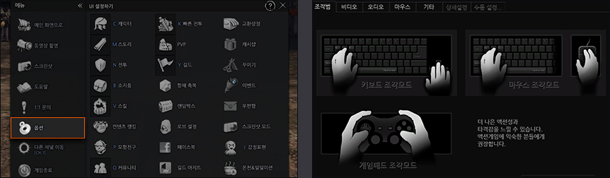 마우스/키보드 조작 모드는 게임 내 [옵션 > 조작법]에서 변경할 수 있습니다
